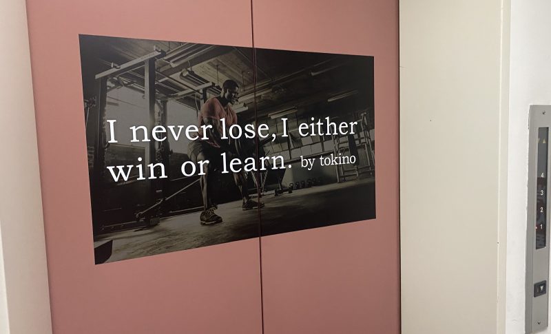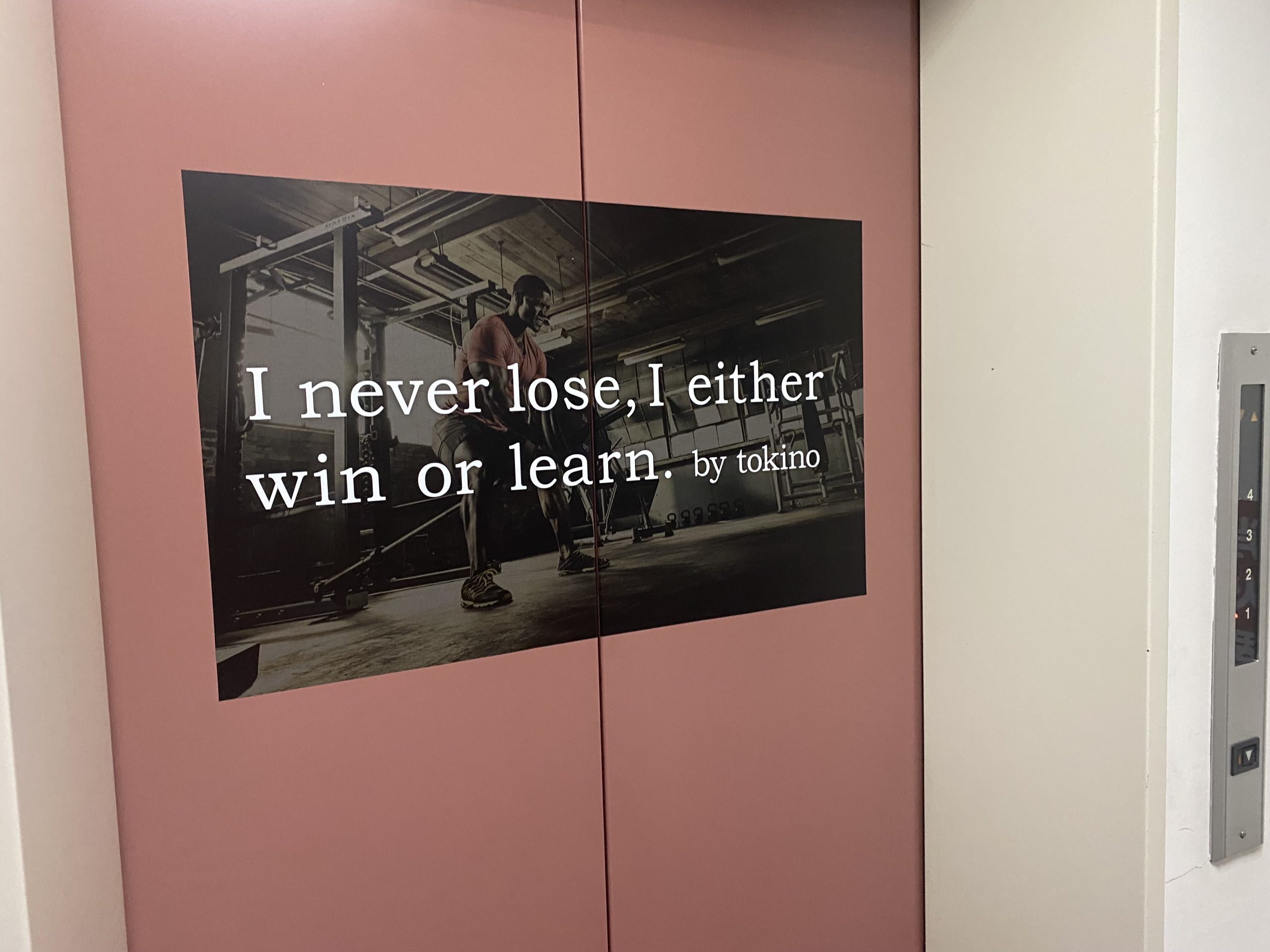 それがナルシスコなのです。4階のエレベーター扉には 「I never lose, I either win or learn.」