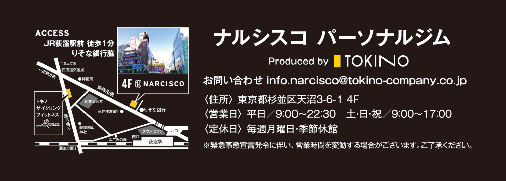 背中トレーニングできれいなバック面Narcisco:ナルシスコ 東京都杉並区天沼3-6-1池田園ビル4階 JR荻窪駅前(徒歩1分)りそな銀行脇